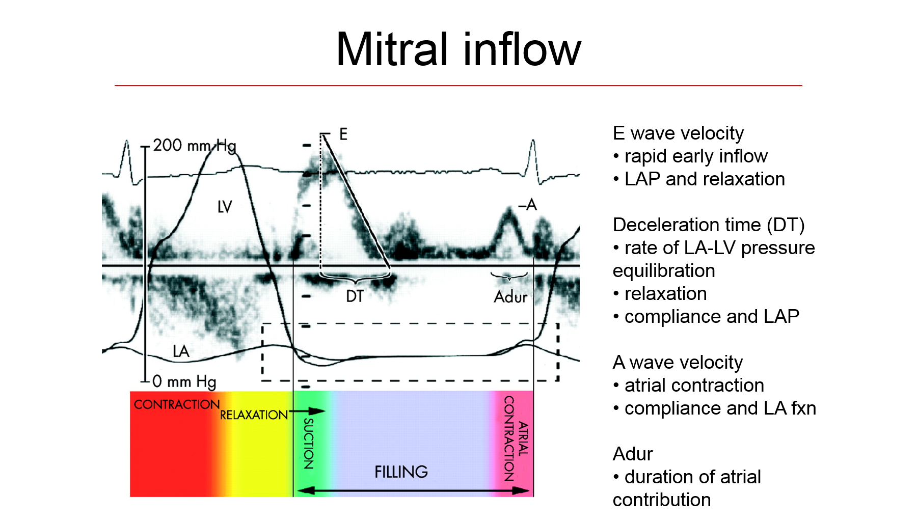 - Mitral inflow: E/A inverted flow means first stage of diastolic function (not in infants, could be normal), in severe diastolic dysfunction E/A>2; DT <140