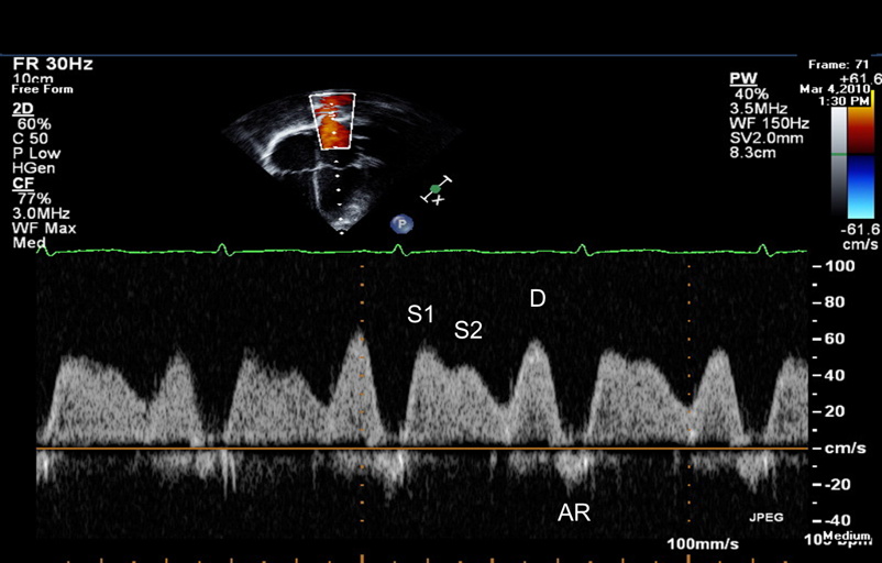 - Pulmonary venous flow: S velocity, D velocity, S/D ratio and AR duration. In diastolic dysfunction D> S and AR duration is longer