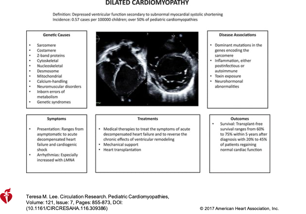 DCM is the most common cardiomyopathy, characterized by enlargement of one or both ventricles and systolic dysfunction. Broad spectrum of cardiac and systemic conditions are associated with DCM (variety of causes): 50% idiopathic and almost 40% are familiar or genetic, 35% and 40% of genetic DCM cases are thought to be caused by sarcomere gene mutations, with mutations in the giant protein titin estimated to be responsible for about 25%. Although genotype–phenotype correlations are lacking for most cases of DCM, mutations in genes such as LMNA (and DES) are known to be highly associated with conduction system disease.