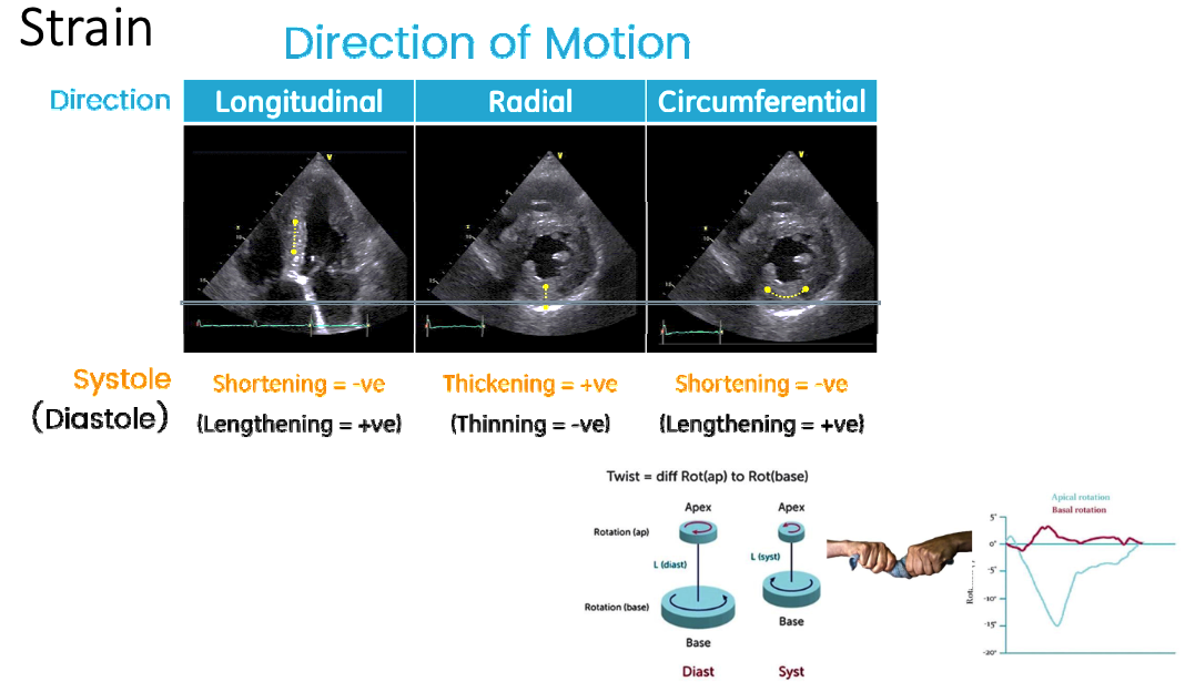 The amount of deformation (positive or negative strain) is usually expressed in %. Positive strain values describe thickening, negative values describe shortening. Strain and strain rate measurements appeared to be sensitive indicators for sub-clinical diseases.