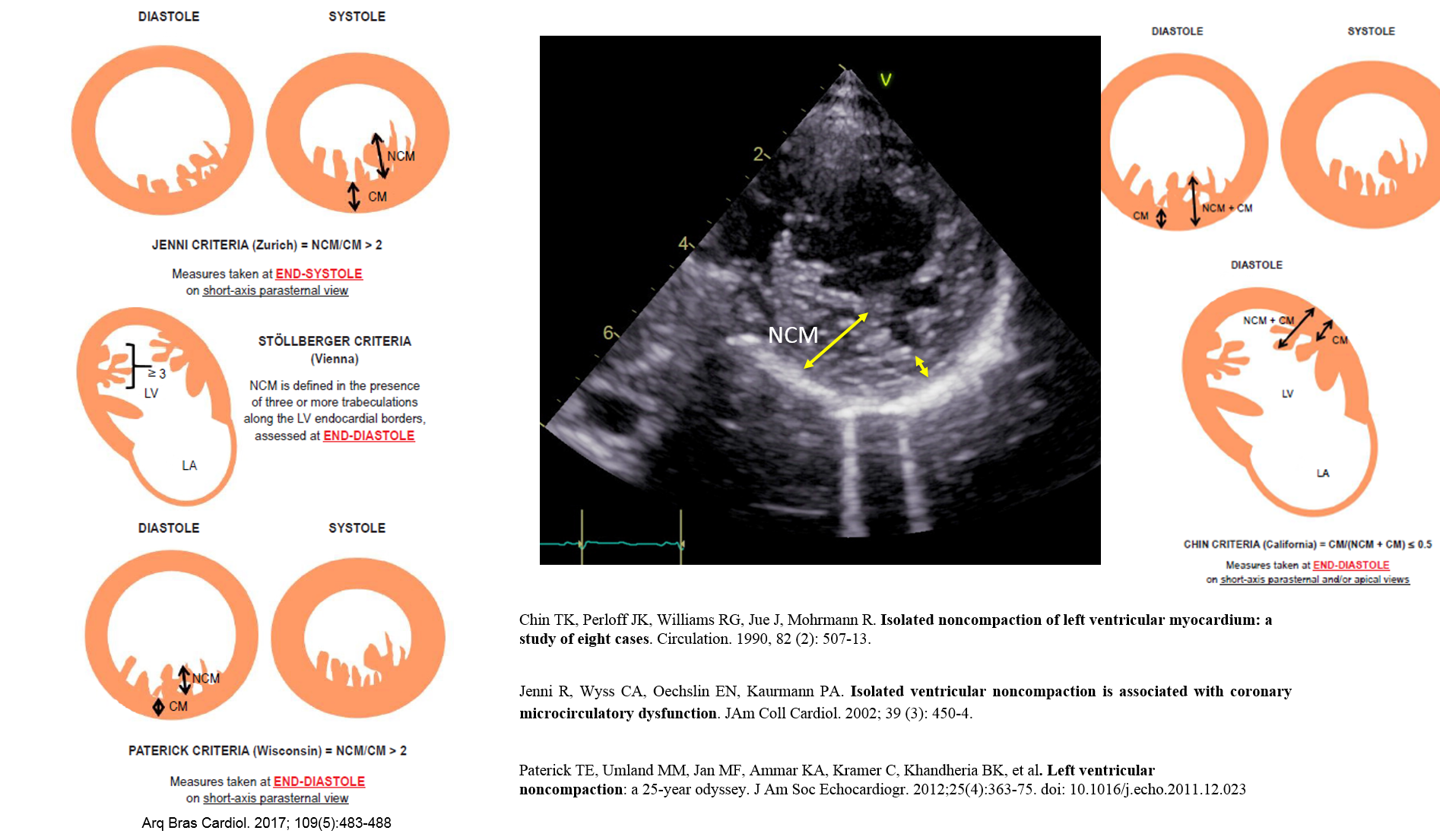 CM recognized as dystinct type in 2006, normally LV is more affected (and is called LVNC) but both ventricle could be abnormal, LVNC is a structural abnormality of the left ventricular myocardium of uncertain etiology and it is speculated that it results from a disturbed compaction process during early development of the LV myocardium. Neuromuscular disorders and chromosomal defects are noted (as example, Barth’s syndrome). It is recommended that first degree relatives of patients with LVNC be investigated for LVNC. Diagnosed is done by Echo (different criteria are used for the diagnosis, see Figure below) that shows prominent trabeculae, intertrabeculae recesses and 2 distinct layers of myocardium (compacted and no compacted). although cardiac MRI is the gold standard test for diagnosis.