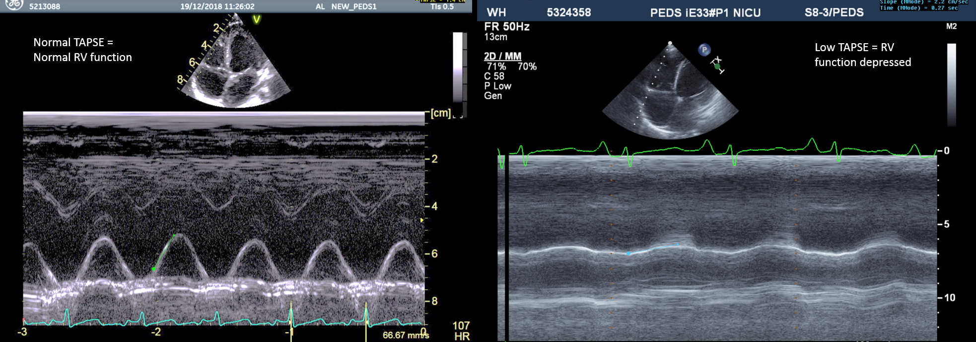 TAPSE (tricuspid annular plane systolic excursion) is easily obtainable and is a measure of RV longitudinal function. It is measured from 4-chambers view in M-mode at the level of the tricuspid annulus, and the value is in mm and represents the displacement of the TV annulus toward the apex in systole. TAPSE < 16 mm in adults indicates RV systolic dysfunction, values TAPSE in children depending of age and BSA.