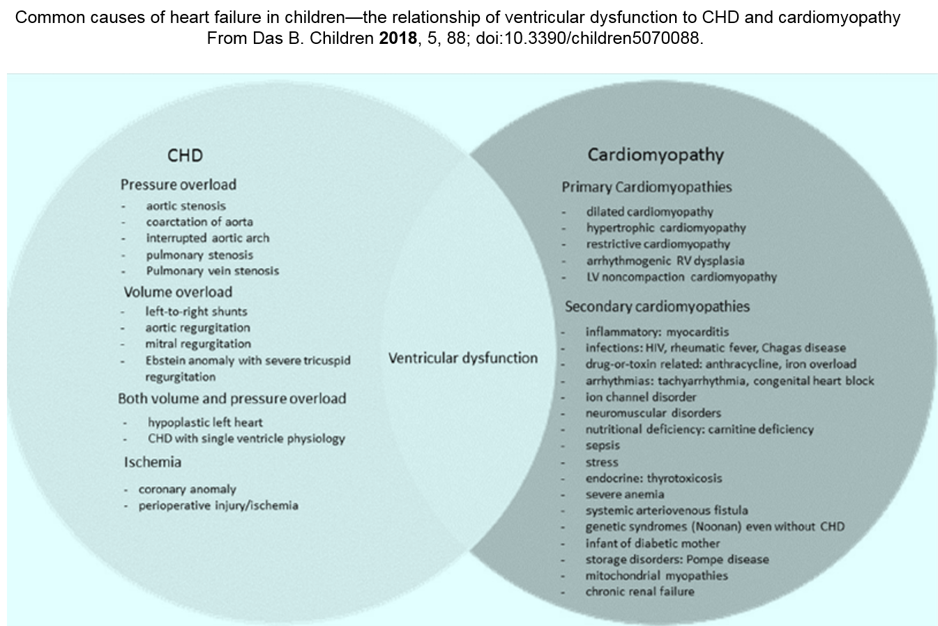 In children, cardiac failure is most often due to CHDs. In the 1st week after birth, CHDs with ductus-dependent systemic circulation (such as severe aortic stenosis/aortic coarctation and hypoplastic left heart syndrome), in which the closure of the ductus arteriosus causes severe reduction of end-organ perfusion. After that period, CHDs provokes HF during follow-up for different mechanisms: pressure overload, volume overload, ischemia (coronary anomalies), pump failure (intrinsic miocardial dysfunction or effect of ventriculotomy), arrhythmias, pulmonary hypertension, and multiple mechanisms could intersect.