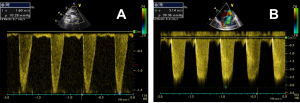 Con el Doppler pulsado (PW) se registra la velocidad en un punto concreto mientras (Figura A) que en el continuo (CW) se registra la velocidad máxima o el gradiente máximo en la zona donde se coloca el cursor (a lo largo de toda la línea) (Figura B) y éste se usa para cuantificar velocidades altas (estenosis).