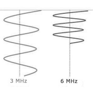Atenuación: Es la pérdida de energía que experimenta un haz de ultrasonidos al atravesar un medio. La atenuación varía con la frecuencia del US, un haz de alta frecuencia se atenúa más y, por tanto, penetra menos que uno con baja frecuencia. De ahí que para el estudio de estructuras profundas se deben emplear transductores de frecuencias bajas (1-3MHz) y para el estudio de estructuras superficiales se deben emplear transductores de frecuencias altas (7-12MHz).