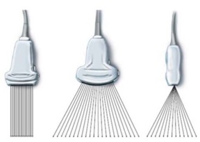 Los transductores emiten múltiples haces de forma lineal, en cardiología se usan los de tipo sectoriales, en forma de abanico (tercer transductor de la figura) cuya ventaja es superficie de contacto pequeña, pero con ángulo de escaneo ancho.