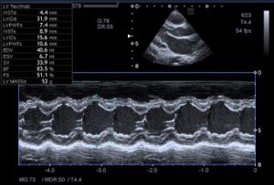 Modo-M: el haz se produce a lo largo de una línea, apareciendo los ecos como puntos de diferente intensidad, en el eje vertical se representan los puntos y el tiempo en el horizontal, su uso más frecuente para la función del ventrículo izquierdo.