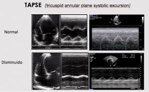 También se utiliza para el estudio de la función del ventrículo derecho mediante el desplazamiento del anillo tricuspideo (denominado tricuspid annulus plane systolic excursion o TAPSE ), que mide en milímetros el desplazamiento del anillo, a mayor desplazamiento mejor contracción longitudinal del ventrículo derecho (en adultos el valor es más de 16mm en niños depende de la edad)