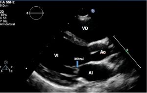 – En este plano podremos realizar la medición de las dimensiones cardiacas, ventriculares y de la aurícula izquierda (AI): para obtener un adecuado plano paraesternal eje largo debemos visualizar de forma simultánea las válvulas mitral y aórtica, posicionando el tabique interventricular y la arteria aorta ascendente lo más horizontal posible en la pantalla. La valoración del anillo aórtico se debe realizar en diástole (válvula aórtica abierta), midiendo anillo, la parte más ancha que corresponde el nivel de los Senos de Valsalva y la unión sino-tubular (unión de los senos con la raíz aórtica).